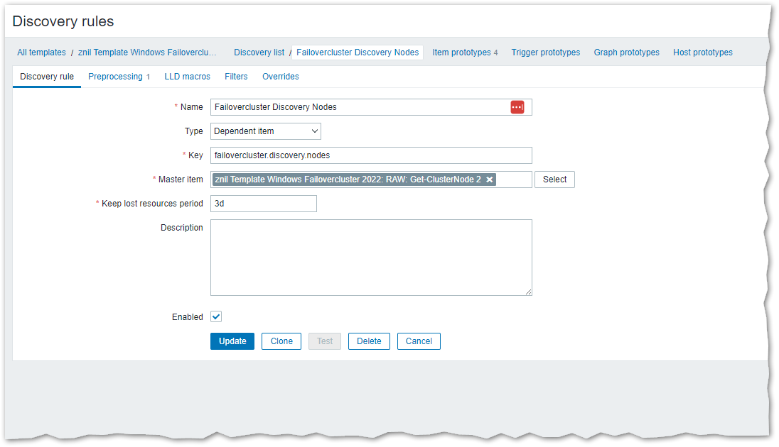 Ich habe hier den Clusternamen als Makro gesetzt, das geht also ohne Probleme und wird von Zabbix ersetzt.