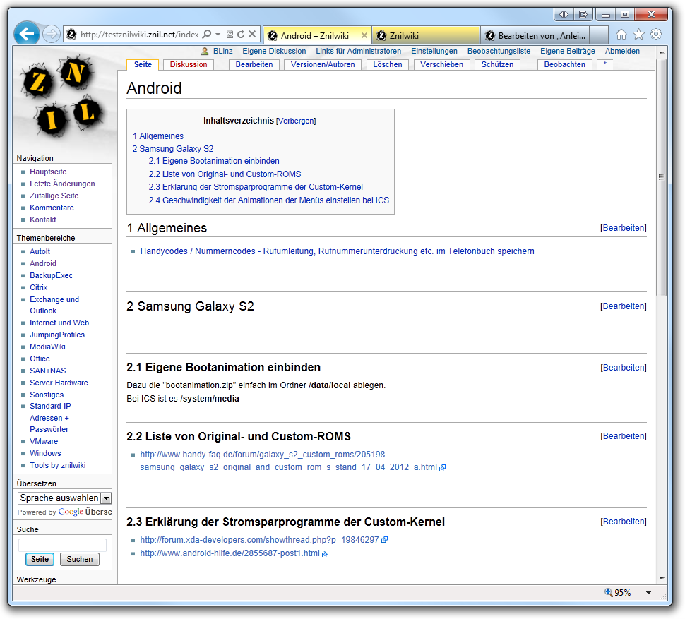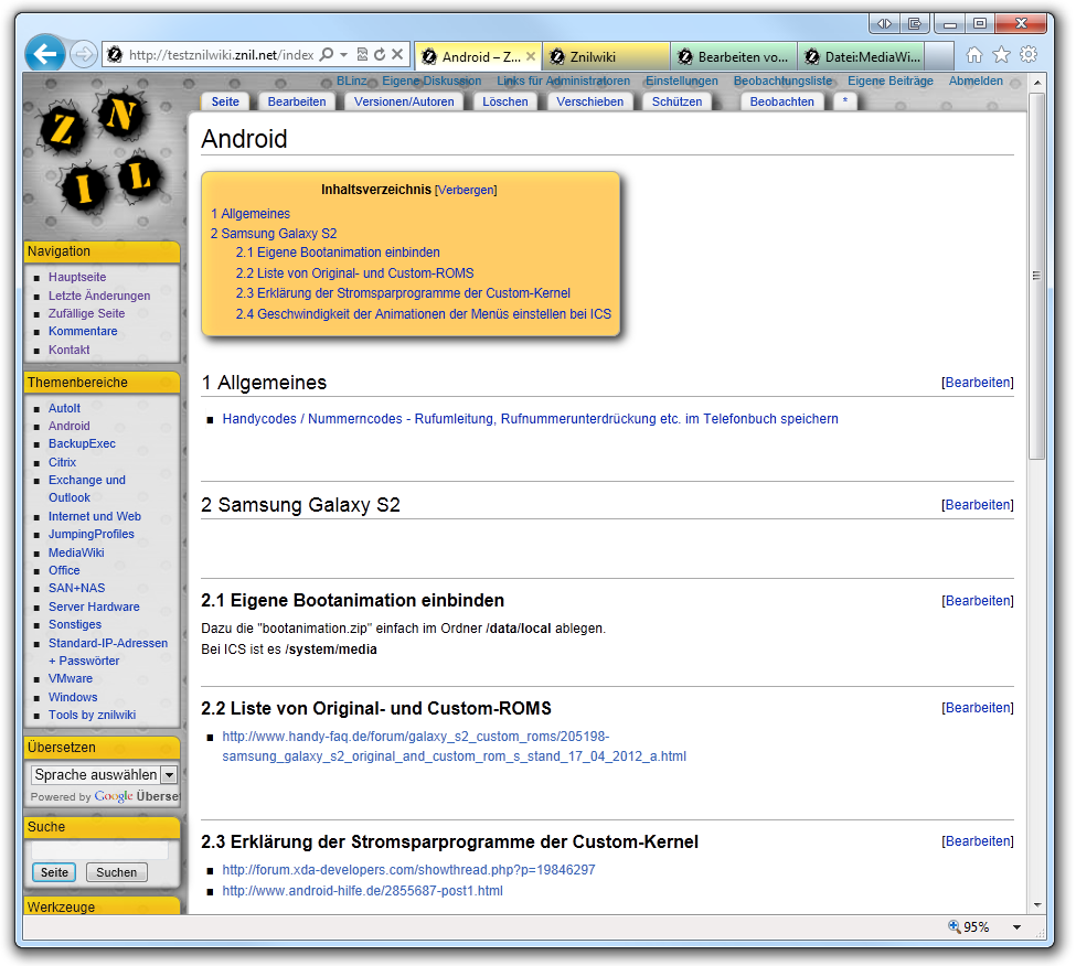 In diesem habe ich die main.css Datei angepasst (runde Ecken, Farben, eigene Styles) - und die MonoBook.php. In dieser habe ich die Rahmen um die Überschriften links in der Navigationsleiste eingefügt.