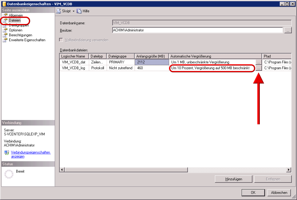 VMware:VMware vSphere - Logfile der Datenbank ist voll (The transaction log for database 'VIM VCDB' is full): Unterschied zwischen den Versionen