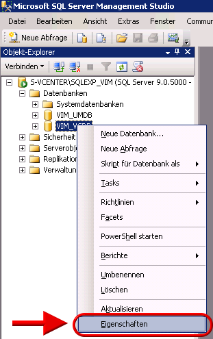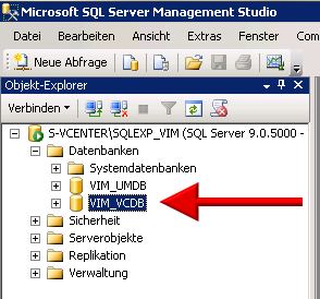 Wir erweitern den Explorer-Baum links auf die vCenter Datenbank VIM_VCDB (die andere im Bild ist die des Update Managers):