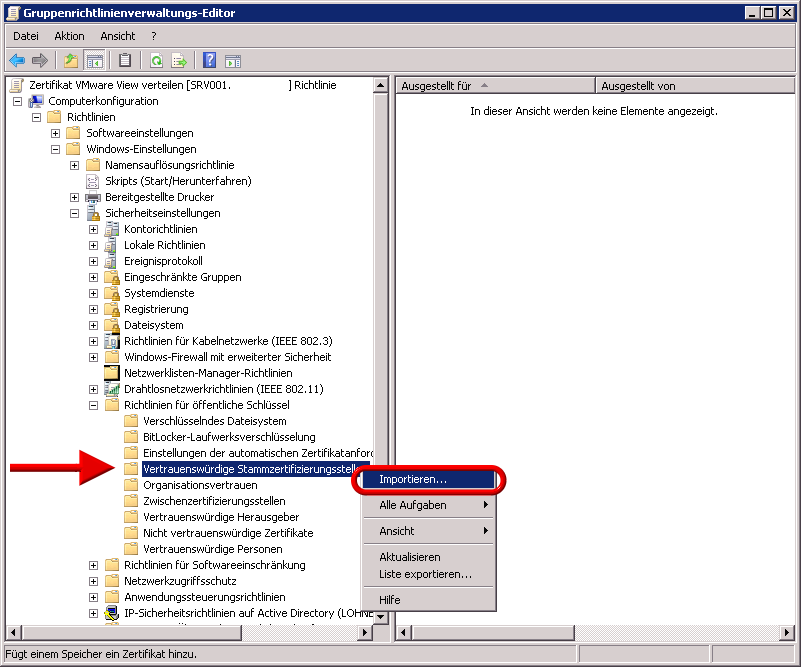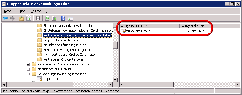 Windows:Gruppenrichtlinen - Vertrauenswürdige Zertifikate / Stammzertifikate per Gruppenrichtlinie (GPO) verteilen: Unterschied zwischen den Versionen