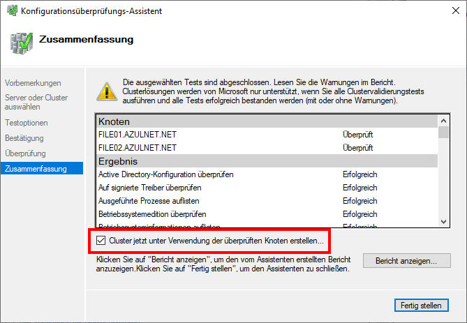 Wir setzen den Haken bei Cluster jetzt unter Verwendung der überprüften Knoten erstellen: