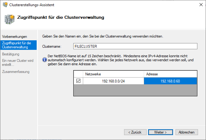 Als NetBIOS Name nehme ich den geplanten Namen FILECLUSTER, als IP die geplante Cluster IP-Adresse (siehe am Anfang des Artikels, .61 und .62 sind die beiden Knoten, .60 die gemeinsame Cluster-IP).