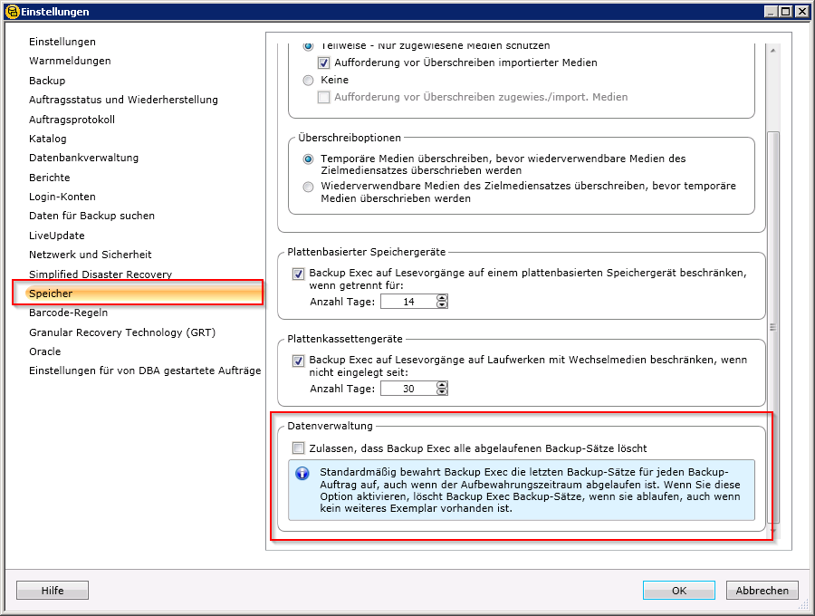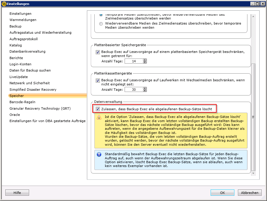 BackupExec 2014 abgelaufende Backups werden nicht gelöscht oder überschrieben