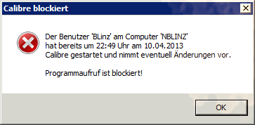 CalibreLockFile.txtim gleichen Verzeichnis. - Diese wird ausgelesen und dem Benutzer eine Fehlermeldung angezeigt: