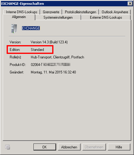 Wenn wir nun die Version des Exchange prüfen steht da Standard:
