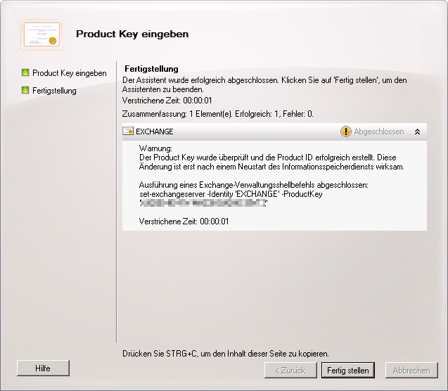 Sollte es diesen Dienst nicht geben weil es sich um einen reinen CAS/HUB Server handelt so wird die Lizenz sofort aktiv und Ihr müsst nichts weiter machen.