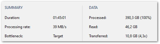 2h25m schneller! Bei sogar 1GByte mehr Daten. und von den 1h45m sind eine Stunde alleine die Retention Policy, also das löschen und zusammenführen alter Snapshots am Ziel.