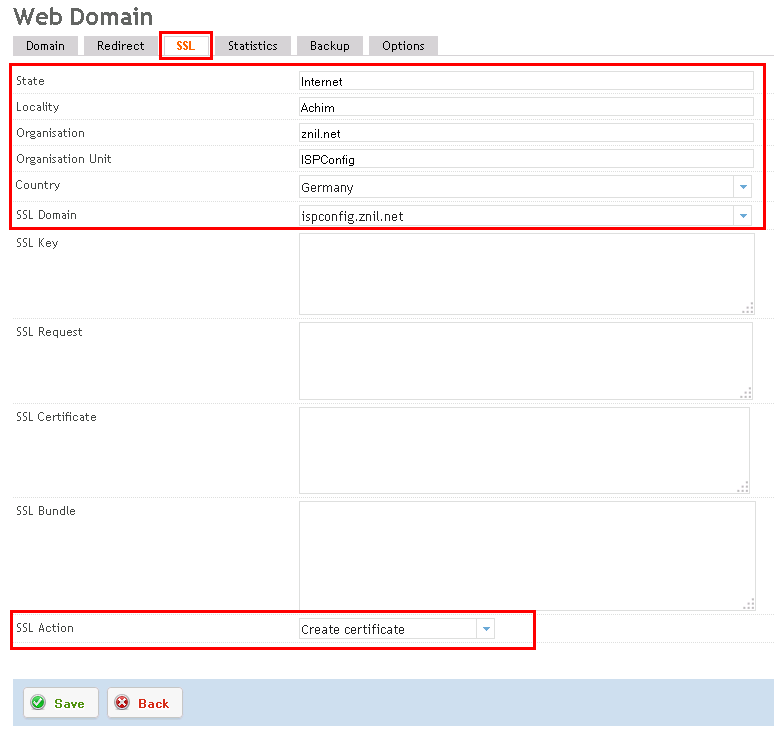 Einfach oben die Daten ausfüllen und unten bei SSL Action den Punkt Create certificate wählen.