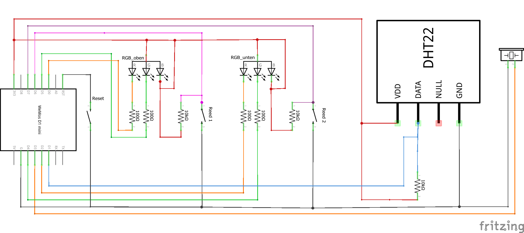 1x Wemos D1 Mini 2x RGB-LED 5mm mit gemeinsamer Anode 1x DHT22 Umweltsensor 4x Widerstand 100 Ω 3x Widerstand 10 kΩ 2x Magnetschalter - Normalzustand geschlossen 1x aktiver Buzzer 1x Taster
