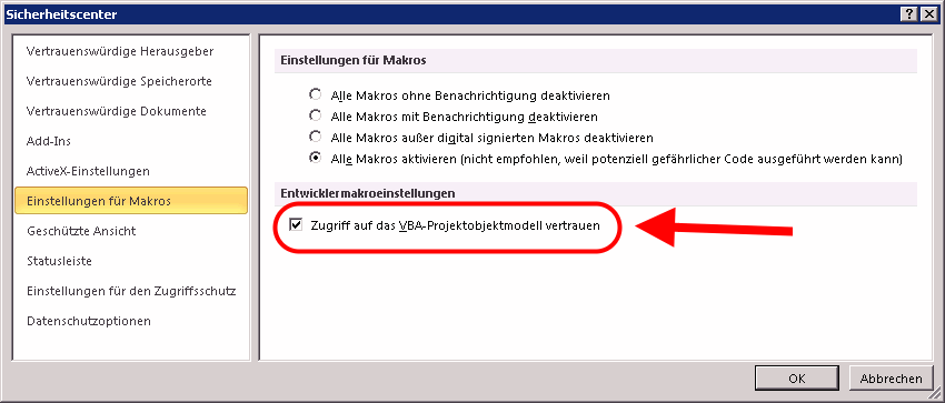 Schritt 1: Wir müssen mal wieder an der Makro Sicherheit schrauben.
