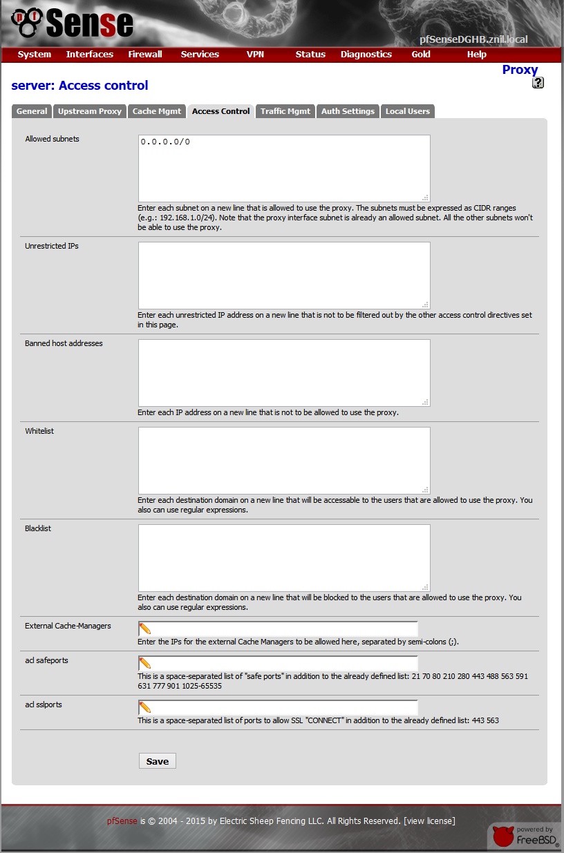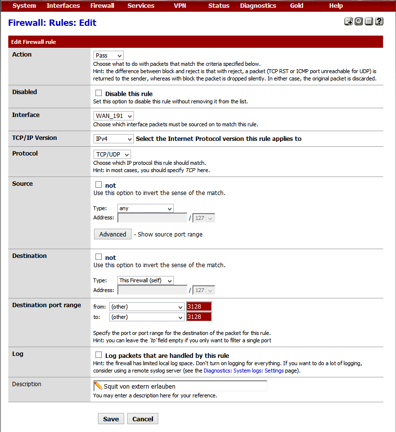 Da wir bei proxyAddress nur 0.0.0.0 eingetragen haben lauscht der Proxy grundsätzlich auf allen IP-Adressen der pfSense. Trotzdem ist kein Zugriff von außen möglich! Die pfSense ist schließlich eine Firewall, ohne entsprechende Regel geht das nicht!