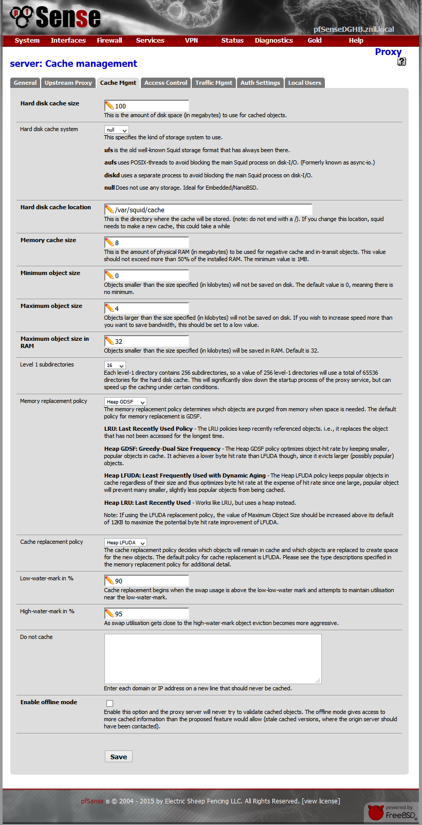 - Wir wählen bei Hard disk cache system aus der Liste null - dadurch gibt es ebenfalls keine Cache-Dateien auf der Festplatten der pfSense