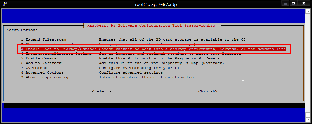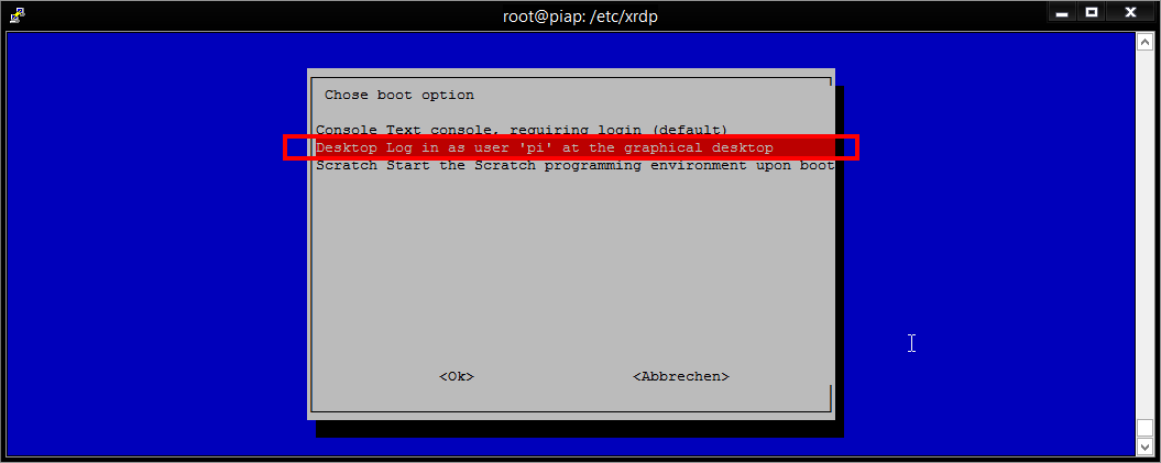 Falls - wie bei mir - euer Pi immer nur in die Console bootet, müssen wir das booten in die grafische Oberfläche einschalten in der Shell: