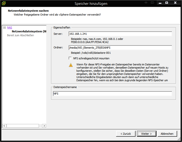 mkdir /media/WD_Elements_2TB/ESXiNFS chmod 777 /media/WD_Elements_2TB/ESXiNFS
