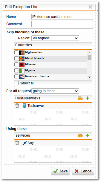 Wir geben der Exception List einen Namen, stellen bei Skip blocking of these All regions ein, For all request auf coming from these - wir erinnern uns, zuvor haben wir From als Blocker genutzt.