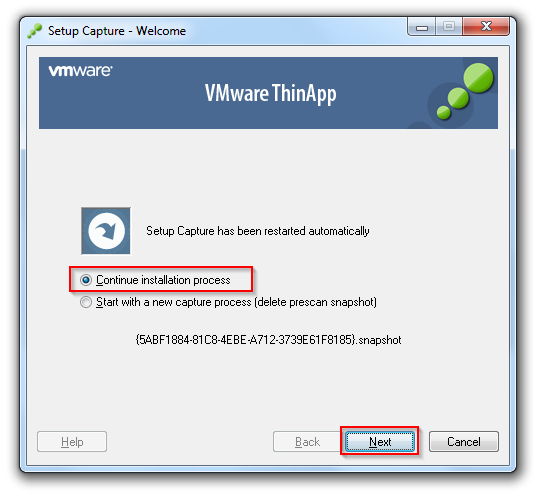 Nach dem Neustart kommt wiederum die Frage von ThinApp, wieder wählen wir "Continue installation process":