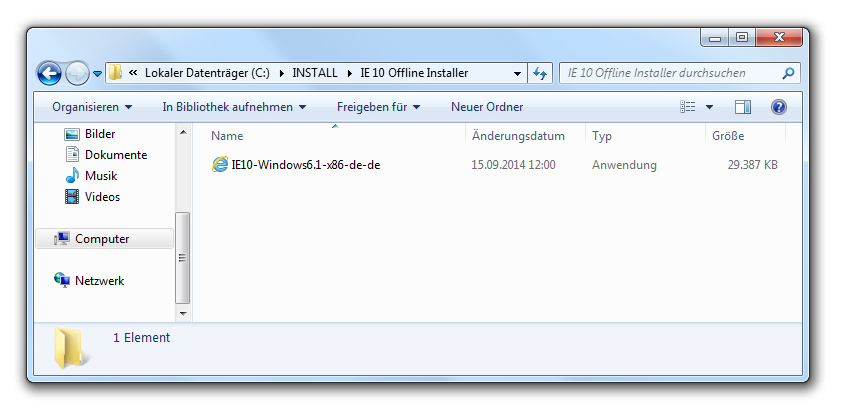 - Öffnet schon mal den Ordner mit dem Installationsprogramm, z.B. IE10-Windows6.1-x86-de-de.exe