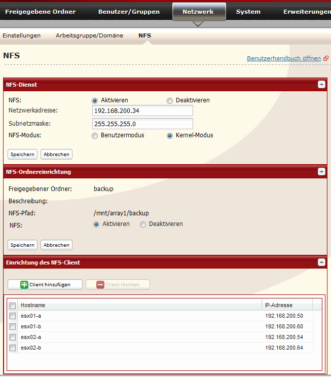 - Bei den Clients müssen die IP-Adressen der VMKernels hinzugefügt werden