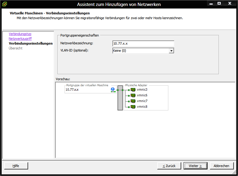Erstellt am ESX/ESXi Server ein neues Netzwerk für virtuelle Maschinen und wählt die NICs dafür aus: