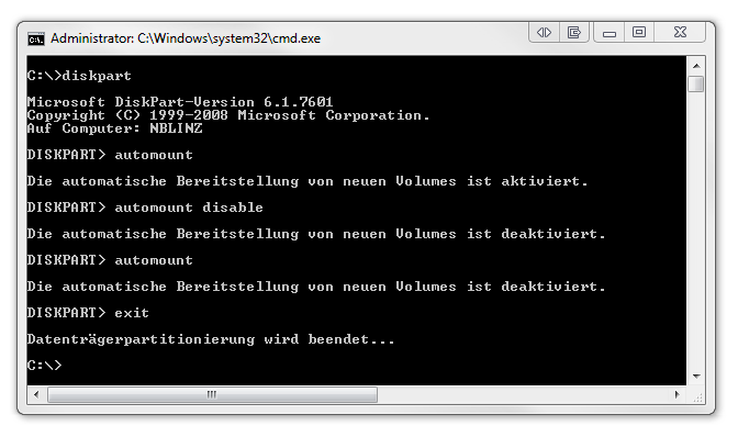 Windows:Automatisches Mounten von Festplatten deaktivieren - diskpart automount disable