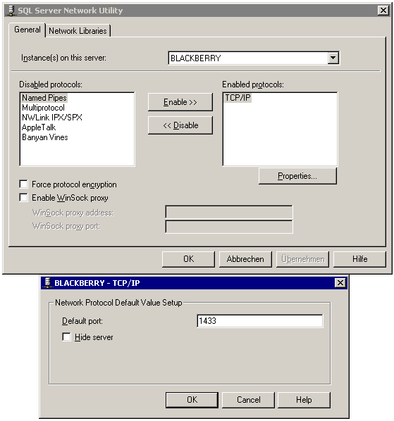 Für die Migration mit dem BlackBerry Enterprise Transporter musste ich aber über das Netzwerk auf diese MSDE zugreifen. Normalerweise wird dies schon beim Setup der MSDE festgelegt - was in diesem Fall nicht passiert war.