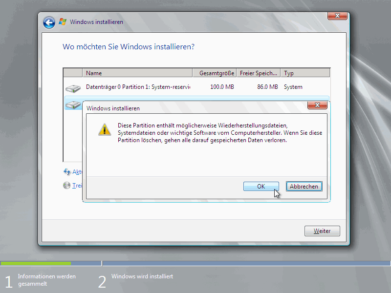 In dieser Meldung lesen wir die Wurzel des übels - er legt die 100Mbyte Partition an