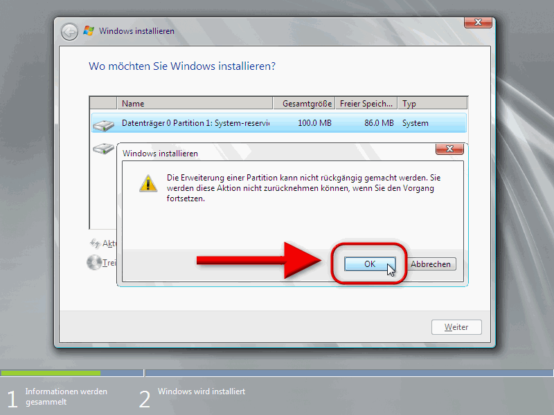 Markieren Sie nun die 100MByte Partition und klicken Sie auf "Erweitern"