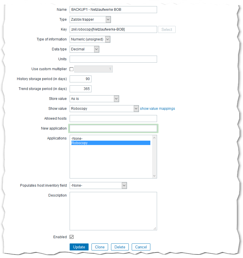Gesendet werden die Daten an den Host der in der Konfigurationsdatei definiert sind - mit dem Item-Key znil.robocopy[Netzlaufwerke-BOB].