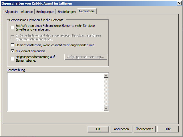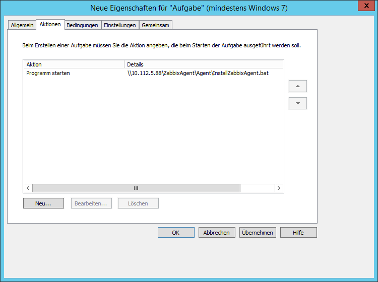 Hinweis: In der Praxis mache ich es dennoch genau so. Statt der InstallZabbixAgent.bat nutze ich jedoch eine weitere Batchdatei InstallZabbixAgentGPO.bat -> Diese prüft ob der Agent schon installiert st und beendet sich in diesem Fall sofort wieder. Fehlt der Agent wird die eigentliche Installation aufgerufen.