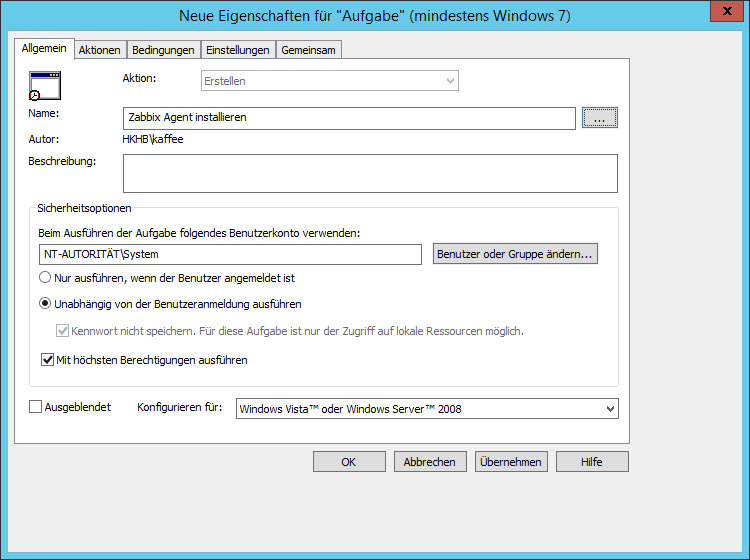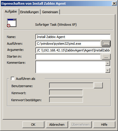 Während dessen gibt es in der Aufgabenplanung auch eine Aufgabe "Zabbix Agent installieren" - die aber nach erfolgreichen Abschluss sich selbst wieder löscht.