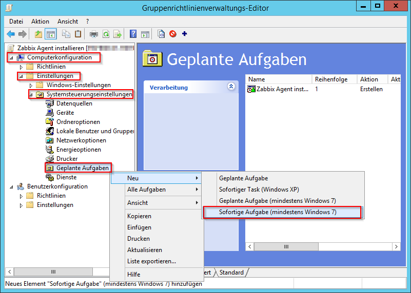 Wir erstellen im Gruppenrichtlinien-Editor auf der gewünschten OU eine neue Gruppenrichtlinie, z.B. "Zabbix Agent installieren" und bearbeiten diese.