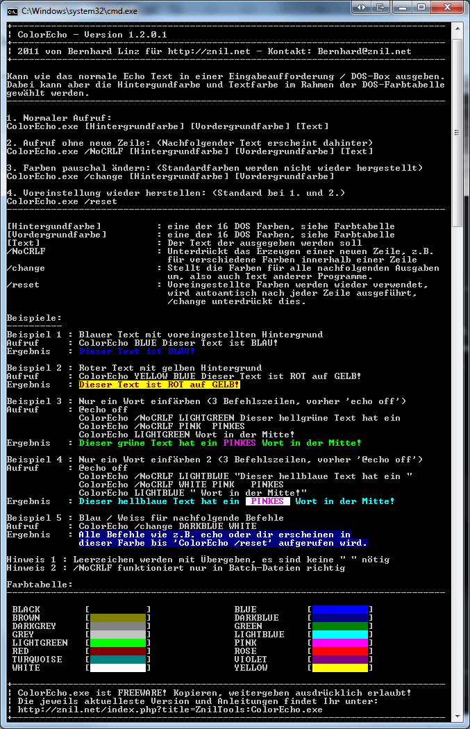 Die eingebaute Hilfe erreicht ihr über den Aufruf von ColorEcho.exe ohne Parameter oder über