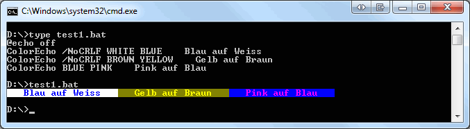 @echo off ColorEcho /NoCRLF WHITE BLUE Blau auf Weiss ColorEcho /NoCRLF BROWN YELLOW Gelb auf Braun ColorEcho BLUE PINK Pink auf Blau